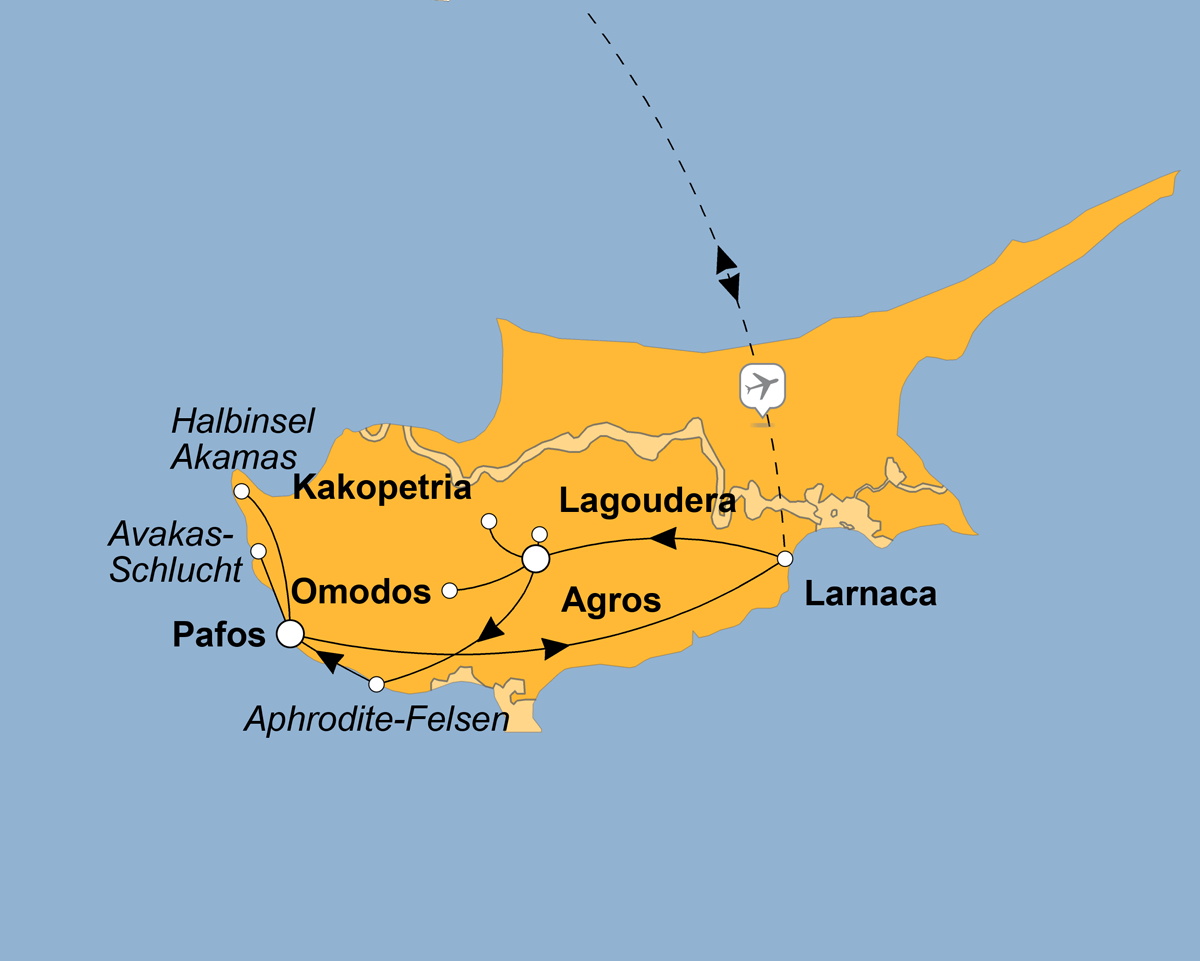 - Besichtigungen: Stadtbesichtigung Paphos, Führung im Archäologischen Park im Haus des Dionysos, Troodosgebirge, Weinregion um Omodos, Scheunendachkirche Ayios Nikolaos tis Stegis, Rosenwasserfabrik in Agros